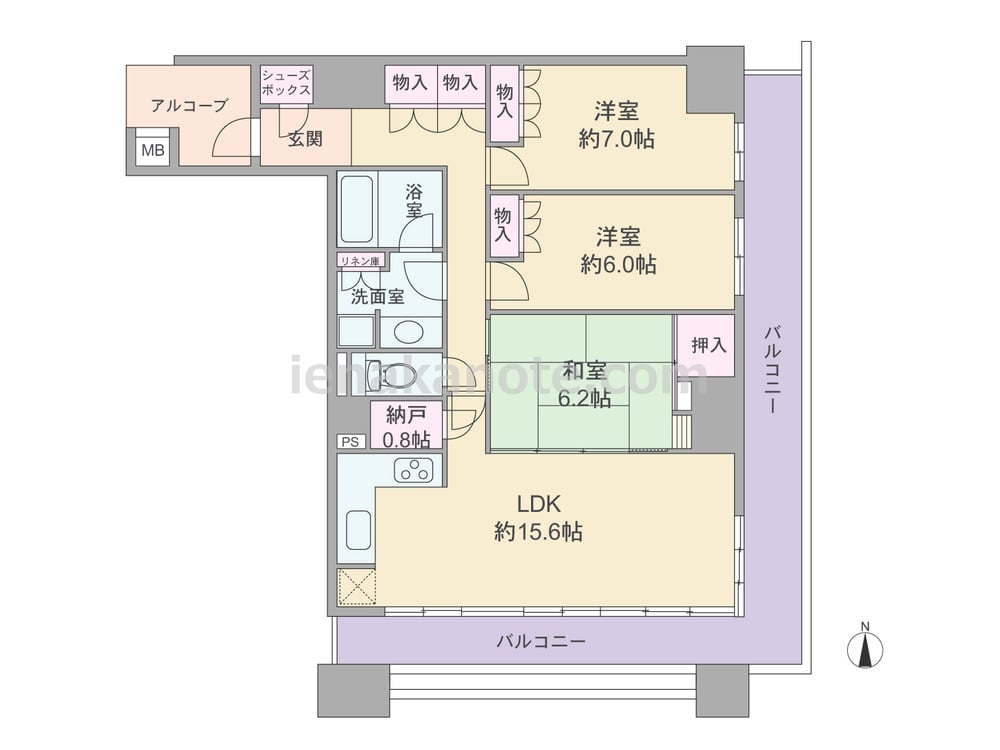 専有面積85.00平米の3LDK。共用廊下に直接面する窓が無い、プライバシー重視のプランです。キッチンはL字型・壁付けタイプ。二面採光+ワイドスパンのLDK約15.6帖は和室の引き戸を開放すれば約21.8帖大の空間にする事が可能。和室は室内廊下からも出入りでき、来客時の客間にも利用できます。全部屋6帖以上あり、収納スペースが豊富にあるのもポイント。バルコニーは約26.26平米の広さがあり、テーブルセットを置けばカフェ気分を味わえます。