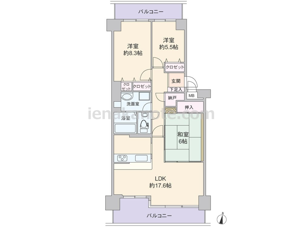 専有面積85.44平米の3LDK。南北両面バルコニーのセンターインプラン。LDK約17.6帖にはコーナーサッシが用いられ、和室の引き戸を開放すれば約23.6帖大の空間に。和室は玄関ホールからもアクセスできます。キッチンは家事中も家族の顔が見える対面式。各居室に収納があり、納戸は日用品のストックや季節の物を収納するのにぴったり。バルコニーは合わせて約21.55平米と広く、ガーデニングを楽しんだり、テーブルセットを置いてカフェテラスにしてもよさそうです。