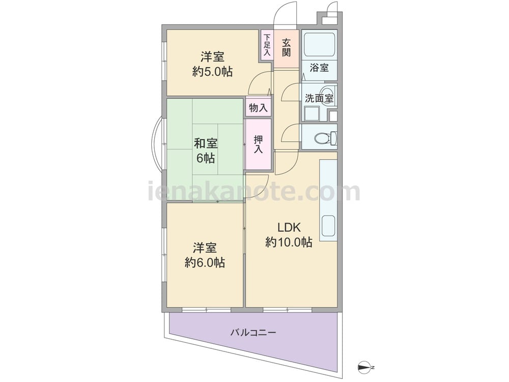 専有面積56.55平米の3LDK。居室の窓が共用廊下に面していないため、廊下を通る人の気配が気になりません。LDKは約10.0帖、キッチンはI型・ウォールタイプの仕様。洋室約6.0帖には収納がありませんが、LDK・和室6帖と続き間になっており、引き戸を開放すれば空間を広く使う事が出来ます。