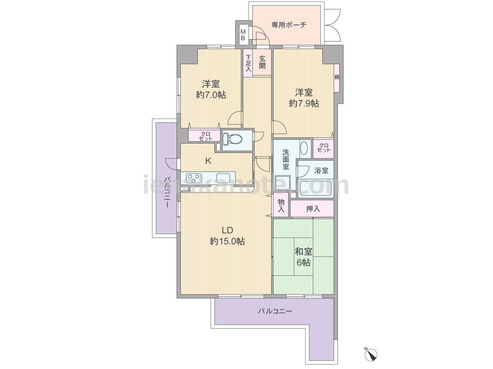 専有面積86.1平米の3LDK。玄関前に専用ポーチがあり、共用廊下に直接面する窓が無い、独立性の高いプラン。リビング・ダイニング約15.0帖には和室6帖が隣接しており、引き戸を開放して2LDKに利用してもよさそうです。対面式キッチンはバルコニーへの勝手口が付いた2WAY仕様。収納が各所にあるのもポイントです。バルコニーが2カ所あり、ガーデニングをたっぷり楽しめます。