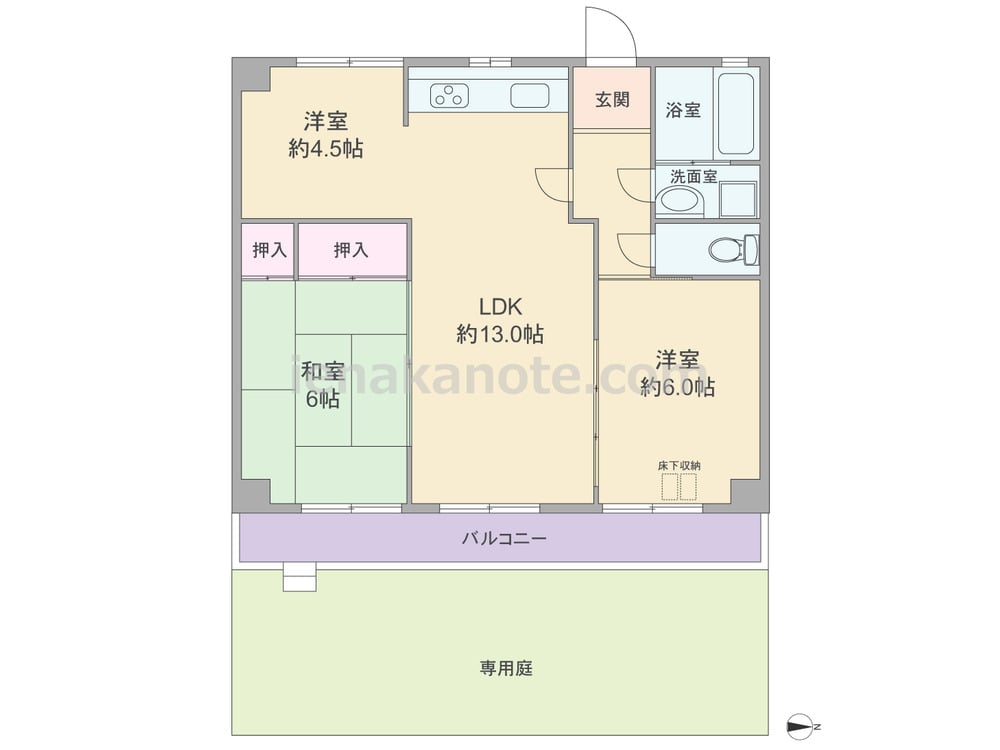 専有面積66.64平米の3LDK。専用庭が付いたプラン。LDKは約13.0帖、キッチンは壁付けタイプで、キッチン前に窓があります。洋室約4.5帖を個室として利用するには建具を用意したり、カーテンで仕切るなど工夫が必要です。洋室約6.0帖は床下収納、和室6帖は押入が設けられています。浴室に換気窓があるのもポイント。専用庭は約28平米あり、子供の遊び場やガーデニング、アウトドアリビングなど色々な使い方が出来ます。