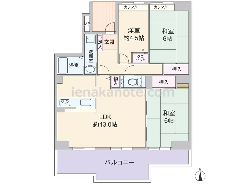 専有面積83.64平米の3LDK。玄関前にアルコーブが設けられています。LDKは約13.0帖、キッチンは対面カウンター仕様。LDKと和室6帖の引き戸を開放すれば、約19.0帖大の一つの空間としても利用出来ます。各居室とLDKに収納スペース付き。トイレ内には手洗いカウンターが設けられています。バルコニーは約18.43平米と広く、天気の良い日はテーブルセットを出してカフェテラスにしてもよさそうです。