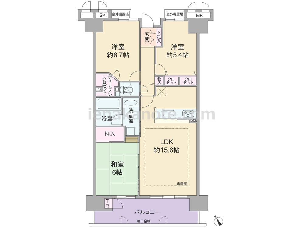 専有面積73.04平米の3LDK。LDKは約15.6帖、キッチンは対面式。キッチンと洗面室(洗濯機置場)への距離が近く、家事効率の良い造りです。和室6帖は個室に利用したり、引き戸を開放して約21.6帖大の空間にするなど色々な使い方が可能。各居室と室内廊下に収納があり、バルコニーのトランクルームはガーデニング用品など外で使う物を収納するのにぴったりです。また、バルコニーは約11.71平米とゆとりがあります。