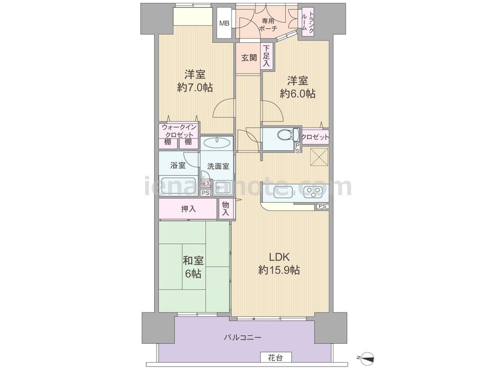 専有面積76.58平米の3LDK。どの部屋も6帖以上の広さが確保されたプラン。玄関前に専用ポーチがあり、ポーチ内のトランクルームは外で使う物を保管するのに便利です。LDKは約15.9帖、キッチンは対面カウンター式で料理中も家族と会話を楽しめる配置。和室の引き戸を開放すればリビング・ダイニングをより広々と使う事が出来ます。全部屋に収納があり、洗面室にも物入付き。バルコニー約12.94平米はガーデニングを楽しめる花台が設けられています。