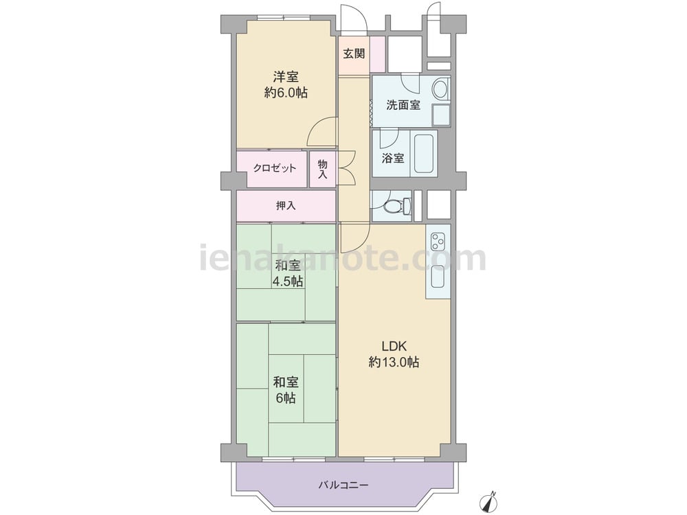 専有面積72.00平米の3LDK。キッチンは壁付けタイプで、リビングダイニングを広く使える配置です。LDKには和室2室(4.5帖と6帖)が隣接しており、それぞれの和室も続き間になっているため、襖を開放すれば大きな一つの空間として利用することもできます。バルコニー側の和室には収納スペースがありませんが、廊下には物入付きです。