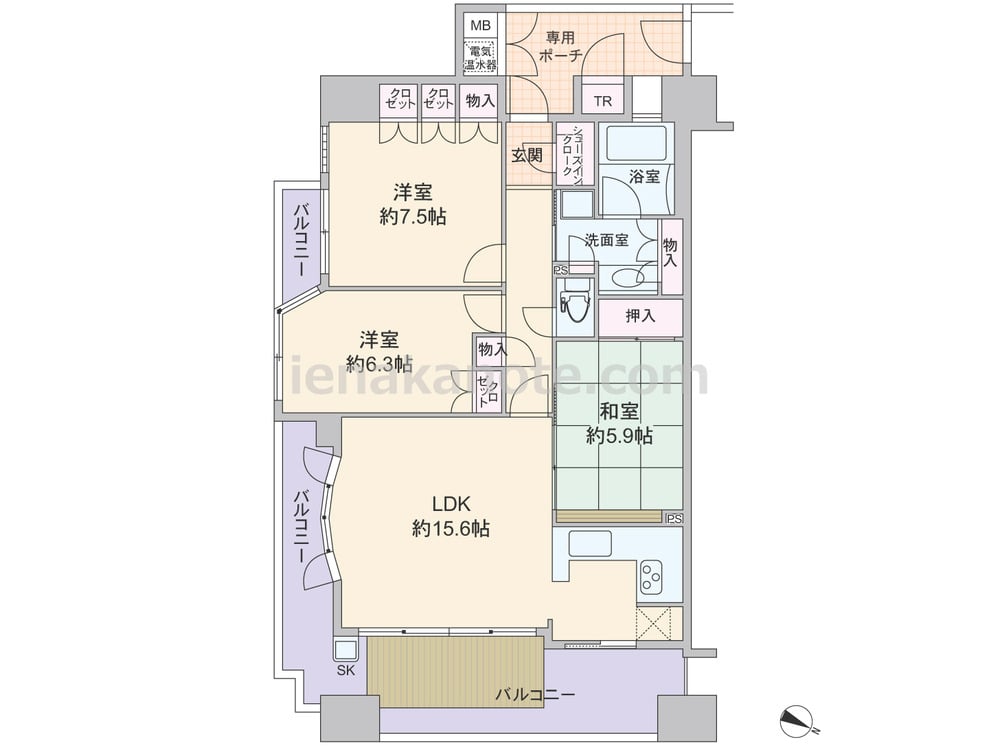 専有面積80.21平米の3LDK。玄関前に専用ポーチがあり、共用廊下に面する窓が無い、プライバシー性の高いプラン。専用ポーチ内にトランクルーム、玄関横ににシューズインクロークが設けられています。LDK約15.6帖はアールの窓が特徴的。L字型のキッチン背面にはバルコニーへの勝手口が設けられています。琉球風畳が用いられたモダンな和室5.9帖はLDKから出入りする造り。洋室約6.3帖はコーナーサッシが用いられています。収納が豊富にあるのもポイント。バルコニーは約20.83平米と広く、スロップシンクやウッドデッキも付いています。
