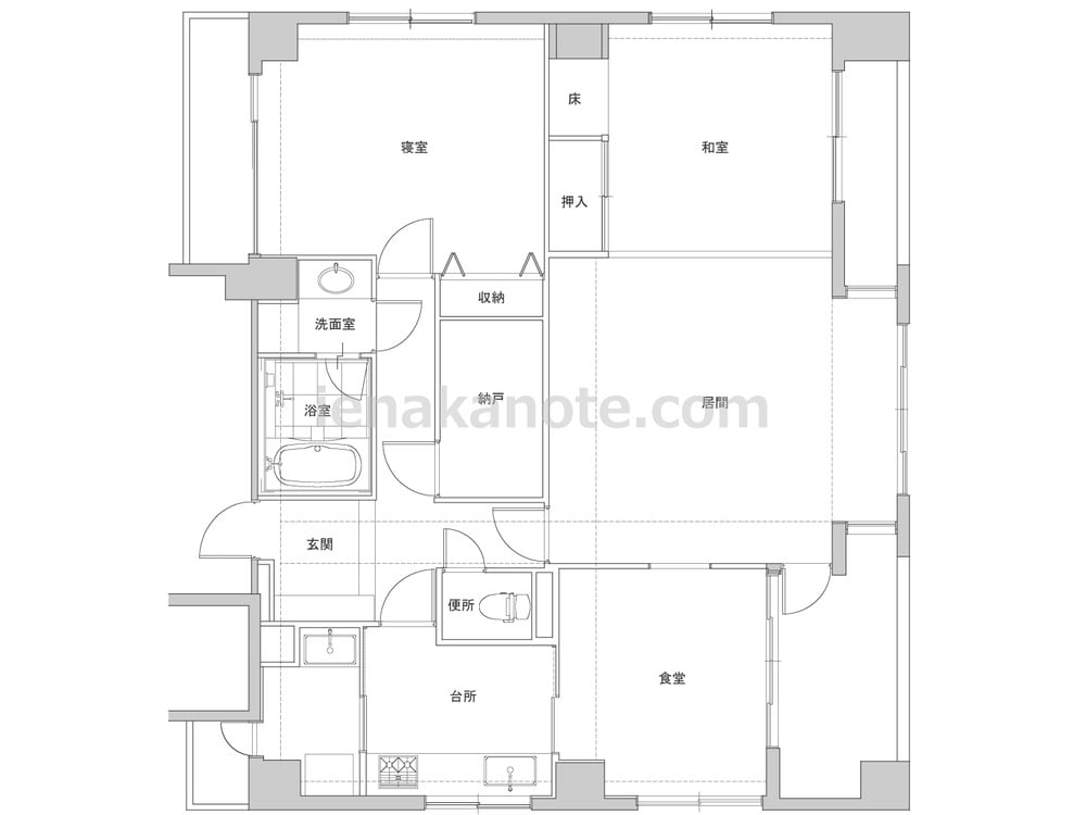 キュービック・ワイドスパンのプラン。玄関正面にリビングがあり、リビング横のダイニング、和室の引き戸を開放すれば大きな空間に利用する事が出来ます。独立型のキッチンは生活感や料理中のにおいが他の部屋に移りにくく、換気に配慮された窓があるのもポイント。キッチン横には洗濯機置場があり、家事効率にも配慮されています。家の中央に納戸があり、季節の物や衣類を収納するのに便利です。