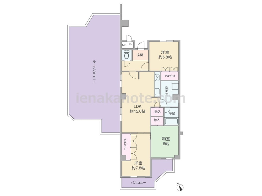 専有面積77.74平米の3LDK。ルーフバルコニーが付いたプラン。LDK約15.0帖は部屋の中央に位置し、キッチンは開放的なI型のウォールタイプ。洋室約7.8帖の引き戸を開放すれば、LDKをよりゆったりと使う事が出来ます。各居室に収納スペースがあり、洗面室前の物入はタオルや日用品を収納するのにぴったりです。