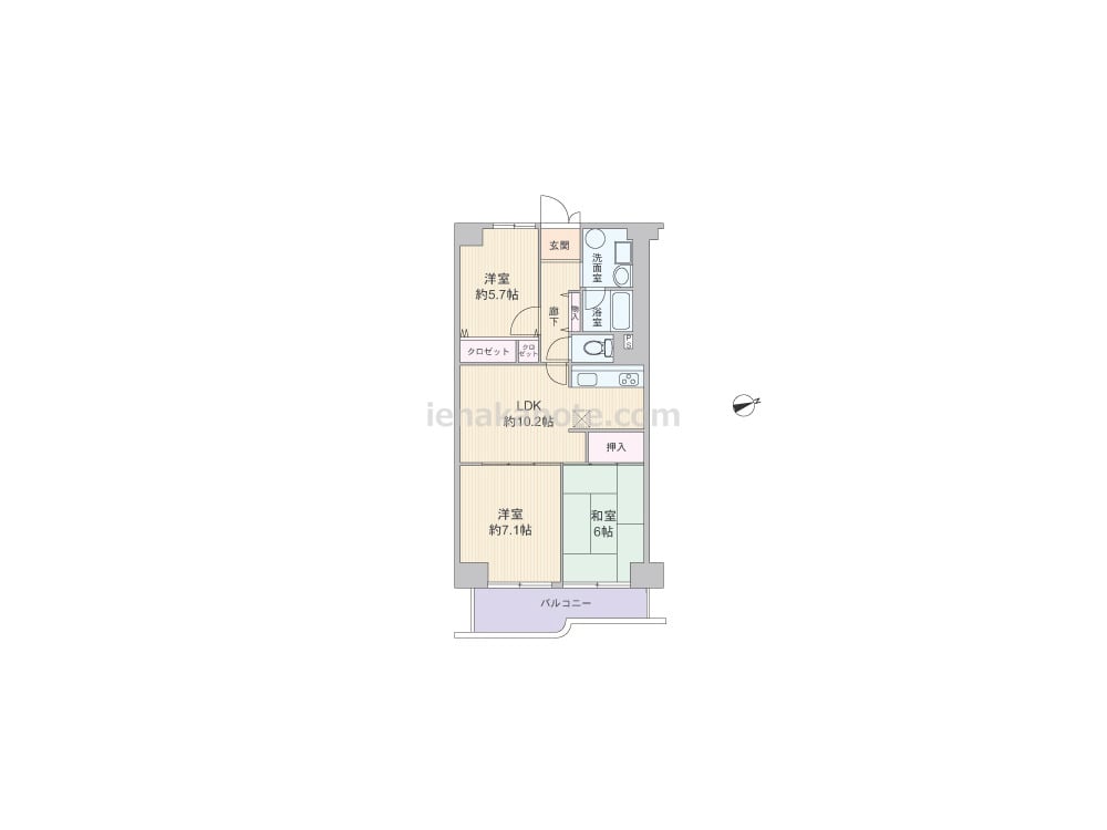 専有面積66.00平米の3LDK。センターリビングのプラン。キッチンは独立型。LDKと洋室が続き間で、約17.3帖の一つの空間としても使用可能。洋室7.1帖に収納スペースはありませんが、廊下に面して物入付きです。