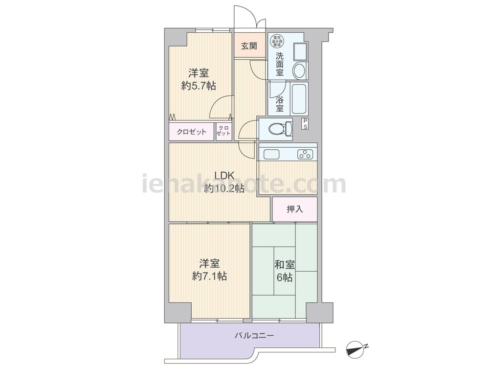 専有面積66.00平米の3LDK。センターリビングのプランで、独立型のキッチンはリビングから見えにくく、リビングはくつろぎの空間を保てます。バルコニー側の2部屋はリビングを通ってアクセスする造りで、家族のコミュニケーションの機会が増えます。洋室約7.1帖には収納が無い為、収納家具を設置したり、LDKとの間の扉を開放して約17.3帖の空間に利用してもよさそうです。