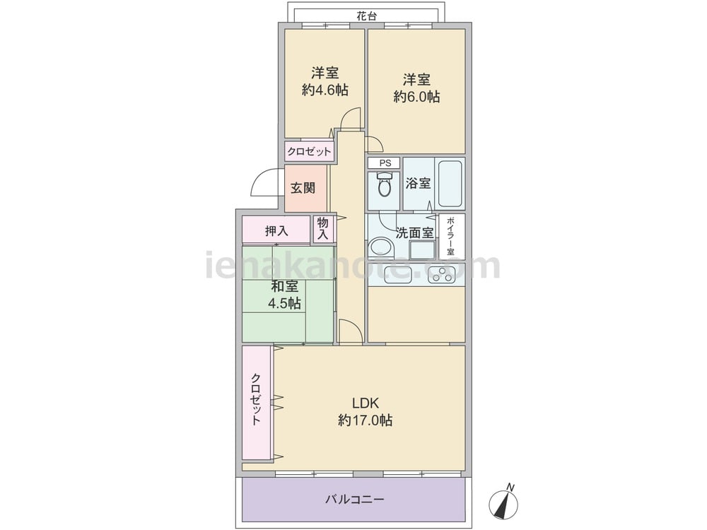専有面積79.73平米の3LDK。共用廊下に居室の窓が面していない、センターインのプラン。LDK約19.0帖には壁一面にクロゼットが設けられています。キッチンはリビング・ダイニングから奥まって配置され、和室4.5帖はLDKと玄関ホールの2カ所から出入りが可能。洋室約6.0帖にはクロゼットが無いため、家具を置くなど少し工夫が必要です。トイレは洗面室を通って出入りする造り。北側の花台はガーデニングを楽しむのにぴったりです。