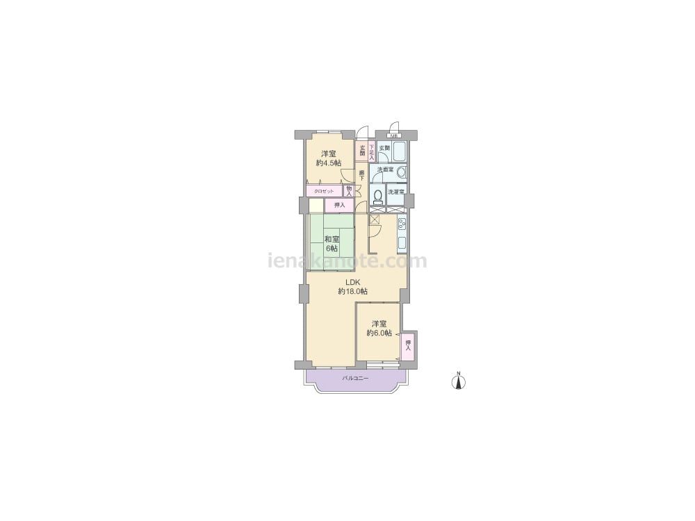 専有面積88.07平米の3LDK。LDKは約18.0帖大と広く、和室6帖・洋室約6.0帖の扉を開放すれば、LDKをより広く使う事が出来ます。キッチンは奥まって配置されており、リビングスペースはくつろぎの空間を演出可能。洗面室と洗濯室がそれぞれあり、トイレは洗面室を通って出入りする造り。各居室に収納スペースが設けられています。