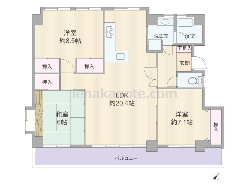 専有面積88.15平米の3LDK。LDKを含む3部屋が南東向き・ワイドスパンのプラン。どの部屋も6帖以上あり、LDKは広々約20.4帖大。和室6帖、洋室約7.1帖の引き戸を開放すれば1LDKとして使う事も出来ます。各居室に収納スペース付き。水回りに窓があるのもポイントです。バルコニーも約14.9平米とゆとりがあります。