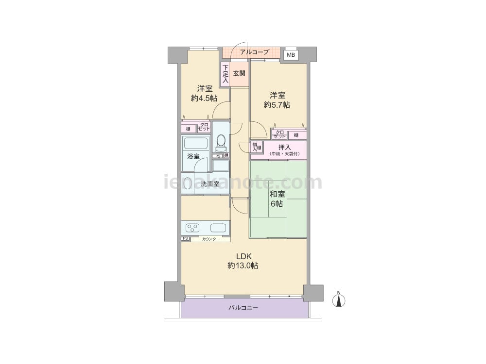 専有面積66.12平米の3LDK。玄関前にはプライバシーに配慮されたアルコーブがあります。LDK約13.0帖に隣接する和室の襖を開放すれば、リビング・ダイニングの延長としての利用にぴったり。対面式のキッチンは作業中も家族と会話を楽しめます。各居室に収納が設けられ、室内廊下にも物入付きです。
