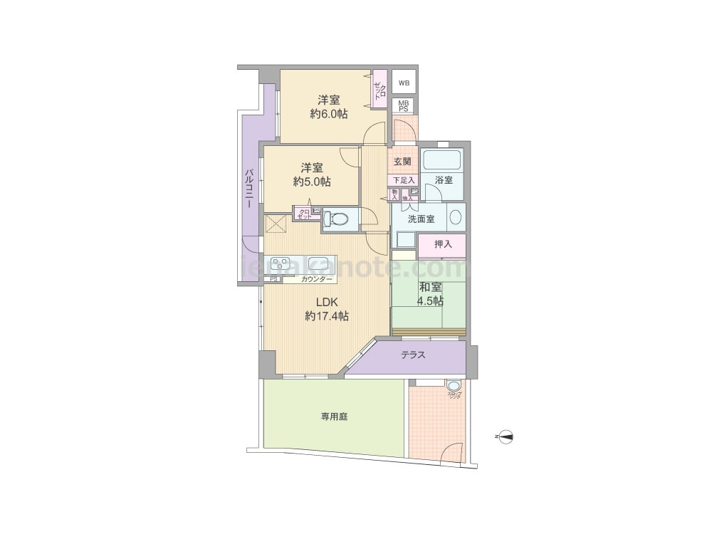 専有面積68.05平米の3LDK。玄関前にアルコーブ付き。キッチンは対面カウンター式で、便利な勝手口付き。LDKと和室が続き間で、約21.9帖大。LDKは明るい2面採光。浴室にも窓があり、換気がしやすく快適。専用庭、テラスがあり、ガーデニングや家庭菜園も楽しめます。