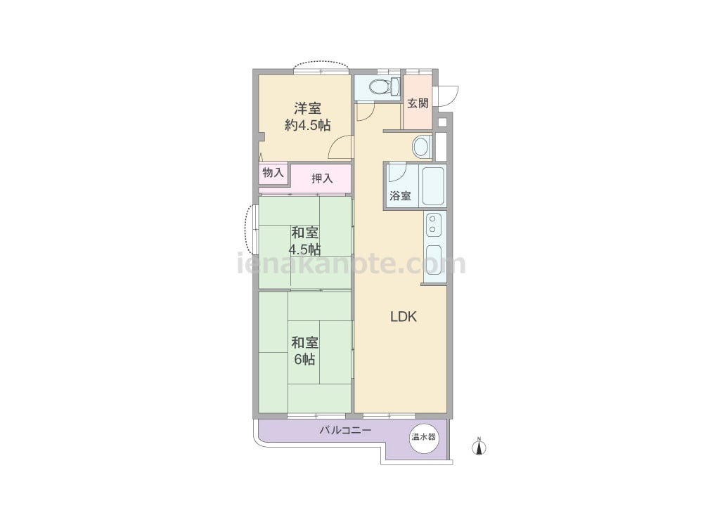 専有面積45.83平米の3LDK。居室の窓が共用廊下に面していない、プライバシーを確保しやすいプラン。和室4.5帖と和室6帖は続き間になっており、引き戸を開放すれば10.5帖大の一室にする事が出来ます。また、LDKとの間の引き戸を開放して、くつろぎのリビングスペースにしてもよさそうです。和室6帖には押入が無いため、場合により家具の設置が必要です。全部屋に窓があり、玄関、トイレにも窓があります。