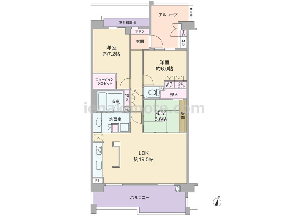 専有面積87.31平米の3LDK。玄関前にアルコーブがあり、共用廊下に直接面する居室が無い、プライバシー性の高いプラン。LDKは約19.5帖大の広さがあり、生活感の出やすいキッチンはリビング・ダイニングとの間をゆるやかに仕切られています。キッチンから洗面室・バルコニーへ行き来が可能な3WAY動線。和室5.6帖には家具を置くのに便利な板間があり、LDK側の引き戸を開放すればリビング・ダイニングをより広々と使う事が出来ます。収納が豊富にあるのもポイント。バルコニー約16.05平米にはスロップシンクが付いており、ガーデニングを手軽に楽しめます。
