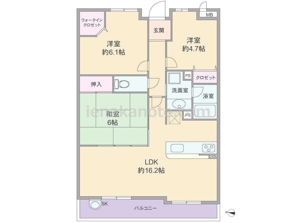 専有面積71.59平米の3LDK。LDKに隣接する和室の引き戸を開放すれば、空間をより広々と使うことが出来ます。対面カウンタータイプのキッチンは料理をしながら家族とコミュニケーションがとりやすい配置。全個室に収納があり、主寝室はウォークインクロゼット付き。スロップシンクの付いたバルコニーは約12.1平米とゆとりがあります。