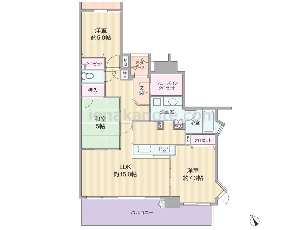 専有面積75.19平米の3LDK。南向き・ワイドスパンのプラン。玄関前に専用ポーチがあり、玄関横には収納力のあるシューズクロゼットが設けられています。LDKは約15.0帖、キッチンは料理中も家族と会話を楽しめる対面式で、洗面室へアクセス可能な2WAY動線です。和室5帖は客間やくつろぎのリビングスペースなど多目的に使える一室。各居室に収納があり、浴室の窓は換気がしやすく快適です。バルコニーは約14.02平米あり、テーブルセットを置けばカフェ気分を味わえます。