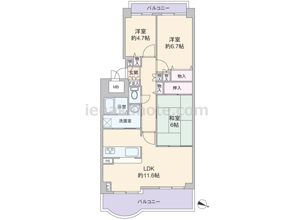 専有面積71.9平米の3LDK。東西両面にバルコニーが付いたセンターインのプラン。LDK約11.6帖は一部コーナーサッシが用いられ、隣接する和室の引き戸を開放すれば約17.6帖大の一室に利用できます。和室は室内廊下からも出入りでき、来客時の客間にも利用しやすい一室です。キッチンは対面式で、洗面室へアクセス可能な2WAY仕様。各居室と玄関ホールに収納があります。