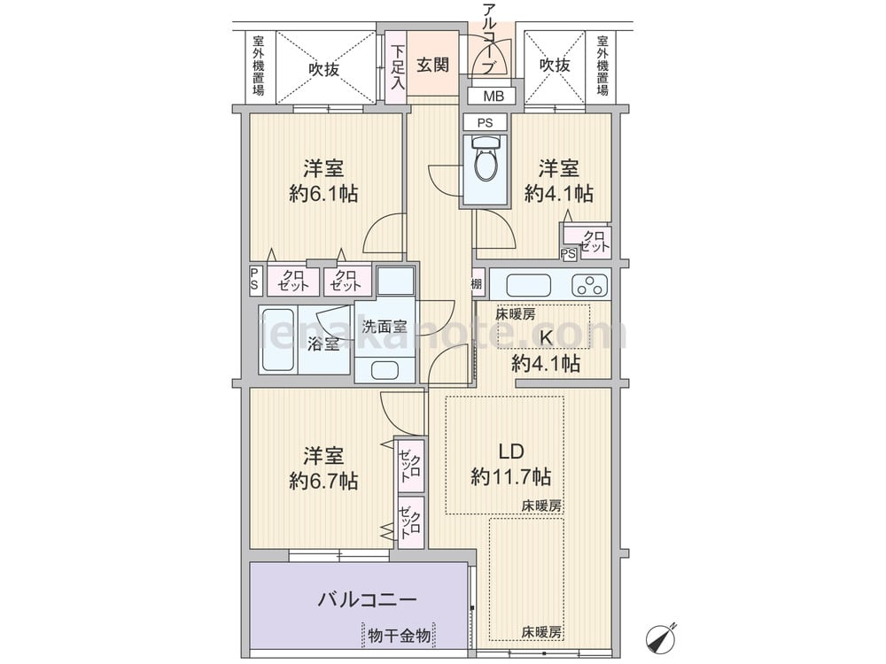 専有面積76.65平米の3LDK。共用廊下と居室の間には吹抜が、玄関前にはアルコーブが付いたプライバシーを保ちやすいプラン。セミクローズ型のキッチンはリビング・ダイニングに生活感が出にくいのが特徴です。主寝室約6.7帖へはリビング・ダイニングを通ってアクセスし、各居室に収納スペース付き。室内廊下には棚も設けられています。