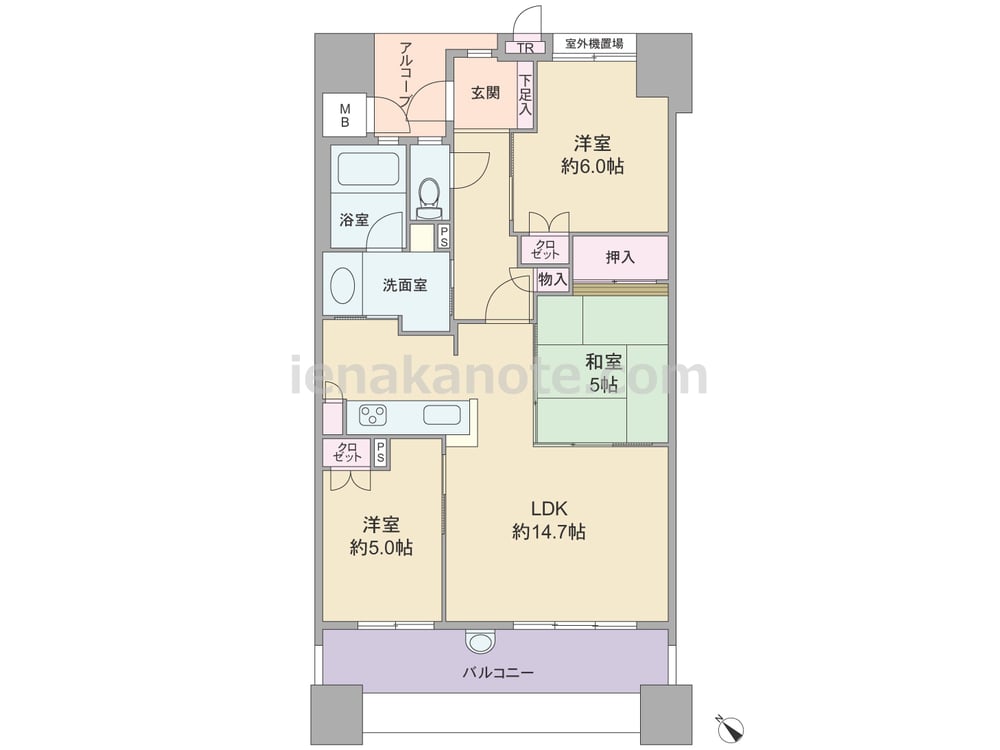 専有面積70.22平米の3LDK。玄関前にアルコーブ、トランクルーム付き。玄関先から室内を見通せず、玄関・トイレ・浴室には換気に配慮された窓があります。キッチンは一部対面式で、洗面室へアクセス可能な2WAY仕様。LDK約14.7帖に隣接する和室5帖の引き戸を開放すれば約19.7帖大の空間に利用できます。洋室約5.0帖を子ども部屋にすればコミュニケーションの機会が増え安心。バルコニー約13.09平米にはスロップシンクがあり、ガーデニングを手軽に楽しめます。