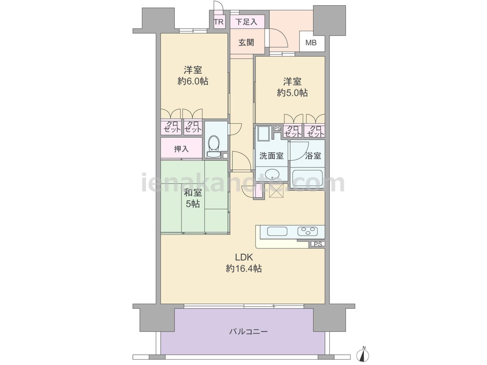 専有面積71.88平米の3LDK。横長リビングのプラン。玄関には通風に配慮された小窓付き。LDK約16.4帖には和室5帖が隣接しており、引き戸を開放すれば約21.4帖大の空間に利用出来ます。キッチンは料理中も家族と会話を楽しめる対面・カウンター仕様。各居室とLDKに収納があり、共用廊下に面してトランクルームも設けられています。バルコニーは約22.05平米と大変広く、テーブルセットを置いてアウトドアリビングにしたり、ガーデニングを楽しむのによさそうです。
