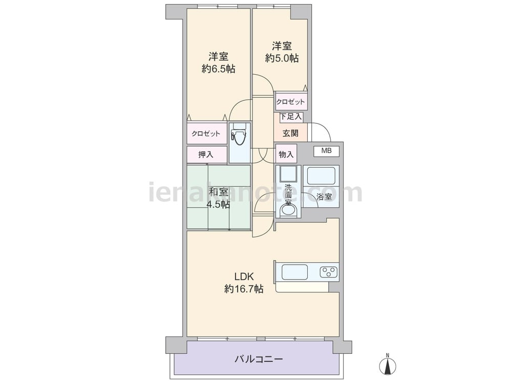 専有面積70.93平米の3LDK。センターインのプラン。LDKは約16.7帖、キッチンは対面カウンター仕様。和室4.5帖の引き戸を開放すれば約21.2帖大の空間にする事が可能。各居室に収納があり、室内廊下にも物入があります。