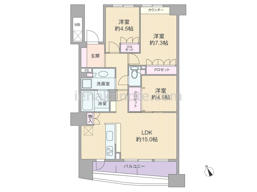 専有面積69.21平米の3LDK。玄関先から室内を見通せない、プライバシーを保ちやすいプラン。LDKは約15.0帖、キッチンは対面式で、バルコニーへの勝手口があるのもポイント。洋室約4.5帖へはLDKを通って出入りし、引き戸を開放すればLDK約19.5帖大にプラン変更できます。各居室に収納があり、キッチン背面にも物入付き。バルコニーは約10.28平米あります。