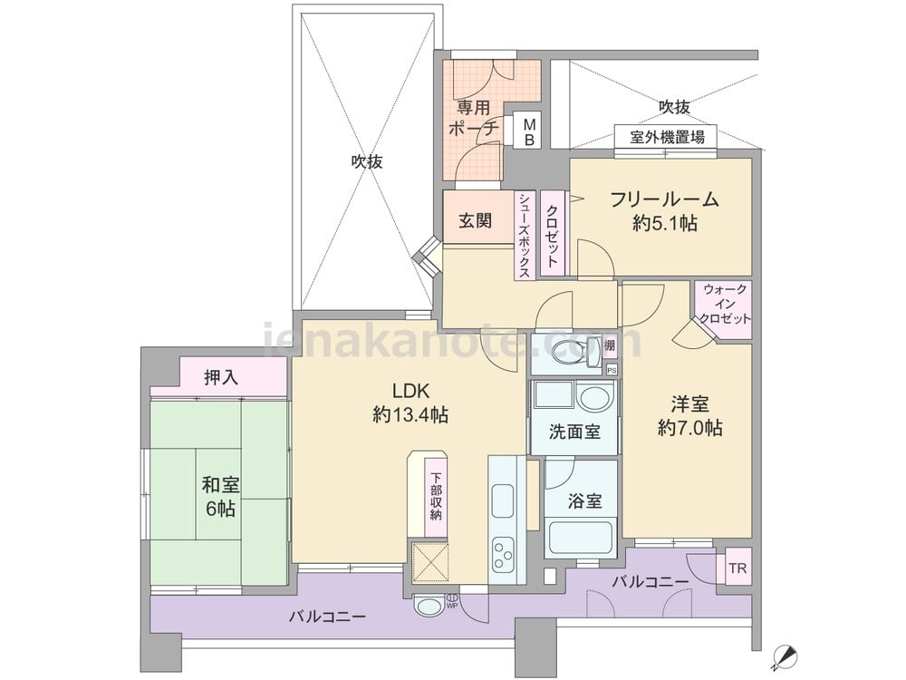 専有面積71.14平米の3LDK。共用廊下と室内の間にポーチと吹き抜けがあるプライバシーに配慮されたワイドスパンのプラン。玄関ホールに出窓付き。LDKを含めた3つの居室と浴室、キッチンがバルコニーに面しており、キッチンに勝手口、浴室に窓があります。約7帖の主寝室にウォークインクロゼット、バルコニーに面してトランクルーム付き。水回りが1カ所に集まり、家事動線にすぐれています。