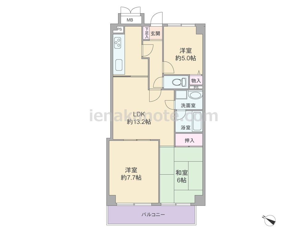 専有面積69.06平米の3LDK。キッチンはリビング・ダイニングへ生活感が伝わりにくいクローズタイプで、玄関ホールからもアクセス可能。洋室約5.0帖以外はリビングを通って行き来するため、家族のコミュニケーションの機会が増えます。洋室約7.7帖にはクロゼットがありませんが、引き戸を開放すればリビング・ダイニングをより広々と使う事ができます。