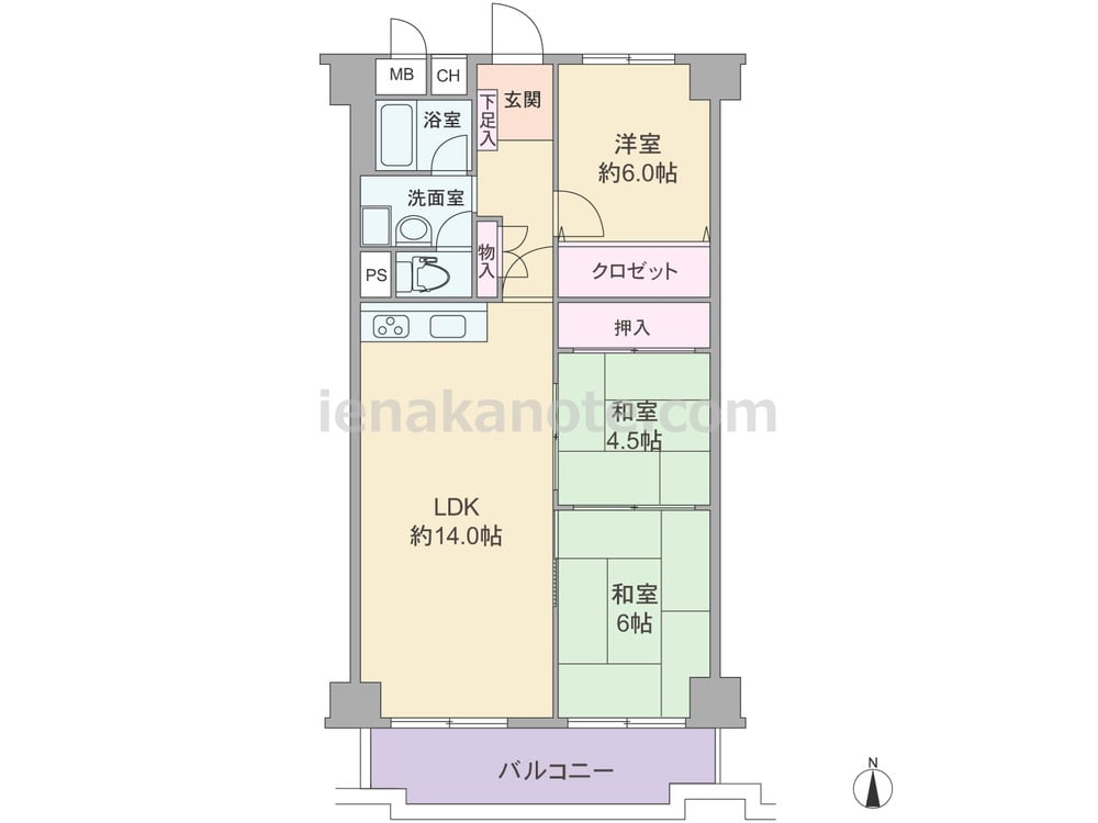 専有面積73.08平米の3LDK。LDKは約14.0帖、キッチンはI型のウォールタイプ。和室4.5帖には窓がありませんが、LDK・和室6帖が続き間になっており、引き戸を開放すれば空間を広々と使う事が出来ます。収納は和室4.5帖、洋室約6.0帖、室内廊下の3カ所にあり、トイレへは洗面室を通って出入りする造り。バルコニーは一部出幅があります。