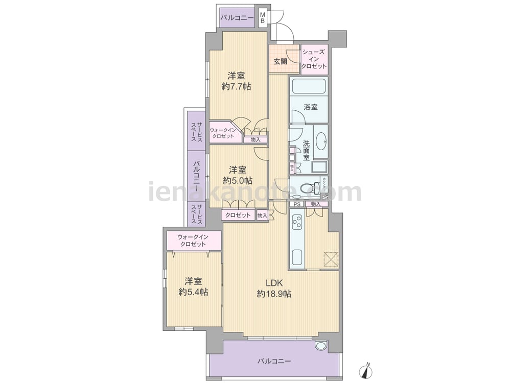 専有面積89.26平米の3LDK。住居の窓が共用廊下に直接面していない、独立性の高い造りです。LDKに隣接する洋室の引き戸を開放すれば、2LDKに間取り変更が可能。キッチンはクローズタイプで、リビング・ダイニングに生活感が出にくいのが特徴です。ウォークインクロゼットが2つ、シューズクロゼットや物入も各所に設けられ、トイレ内には手洗いカウンターもあります。バルコニーが全部で3カ所あり、LDKに面するバルコニーのスロップシンクは洗い物、ガーデニングに便利です。