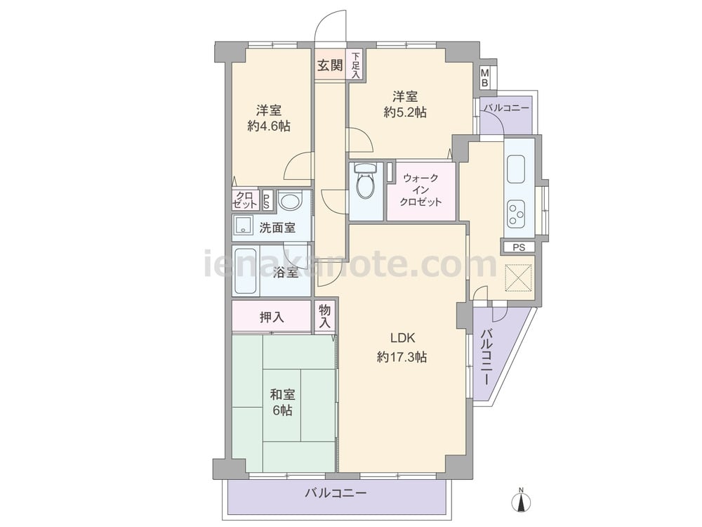 専有面積73.00平米の3LDK。LDK約17.3帖には和室6帖が隣接しており、引き戸を開放すれば空間をより広々と使う事が出来ます。クローズタイプのキッチンはリビング・ダイニングへ生活感が伝わりにくく、三方に窓があるため料理中も換気がしやすく快適です。各居室に収納があり、洋室約5.2帖は収納力のあるウォークインクロゼット付き。バルコニーは全部で3カ所設けられています。
