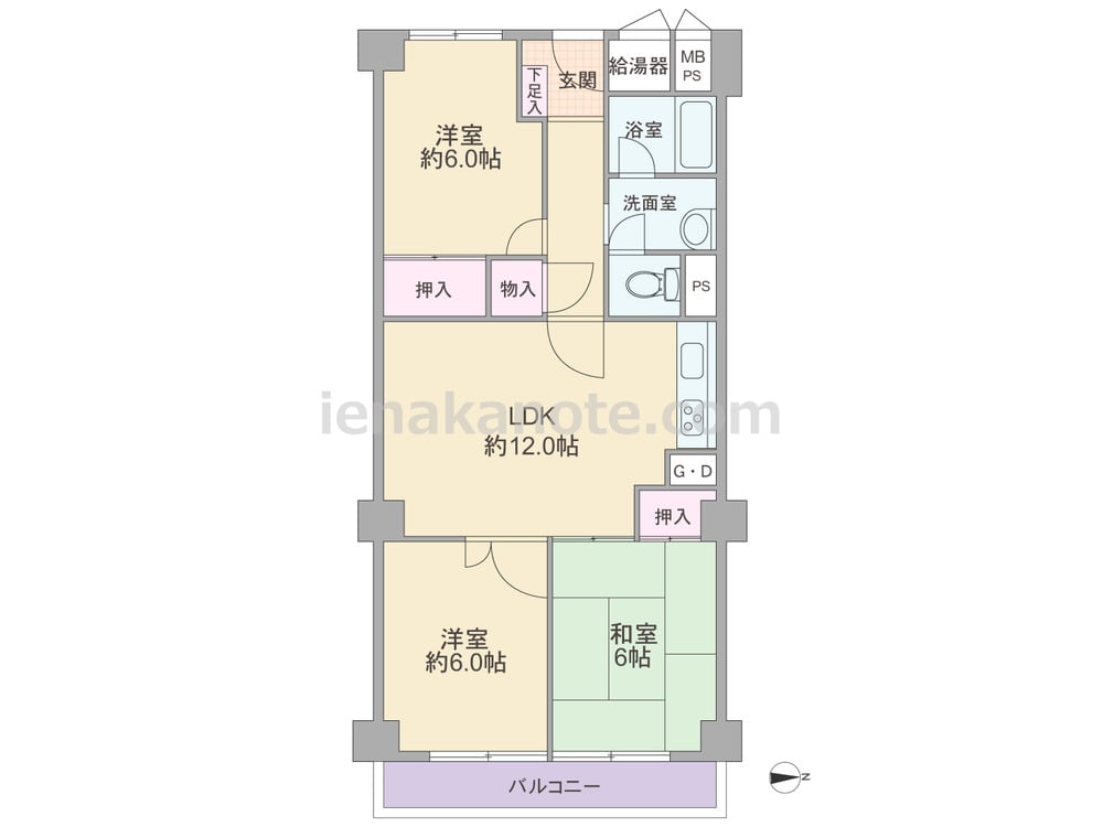 専有面積66.00平米の3LDK。全室6帖以上の広さがある、センターリビングのプラン。玄関扉は防犯性に配慮された内開き型です。キッチンは開放的なI型のウォールタイプ。バルコニーに面する洋室約6.0帖には収納が無いため、家具を置くなど少し工夫が必要です。トイレは洗面室を通って出入りする造りのため、トイレ・洗面室使用時の動線が重なっています。