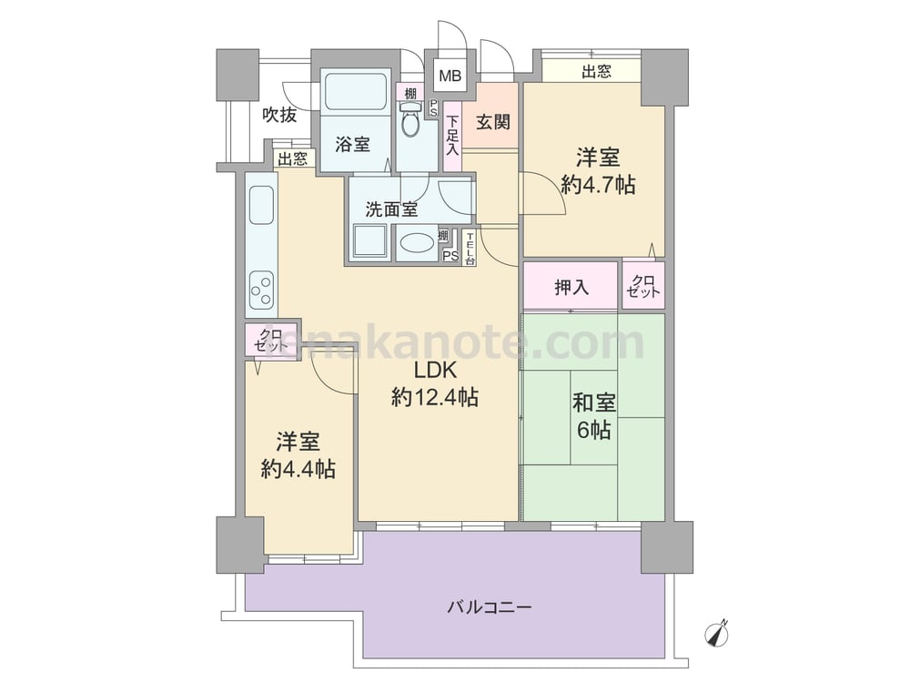 専有面積59.68平米の3LDK。全部屋と水回りに窓がある、風通しの良いワイドスパンのプラン。キッチンはリビングを有効利用できるセミクローズ仕様。LDKと続き間の和室は個室やリビングの延長など多目的に使える一室です。洋室約4.4帖にはコーナーサッシが用いられています。各個室に収納付き。LDKにはTEL台もあります。出幅のあるバルコニーにテーブルセットいてカフェテラスにしてもよさそうです。