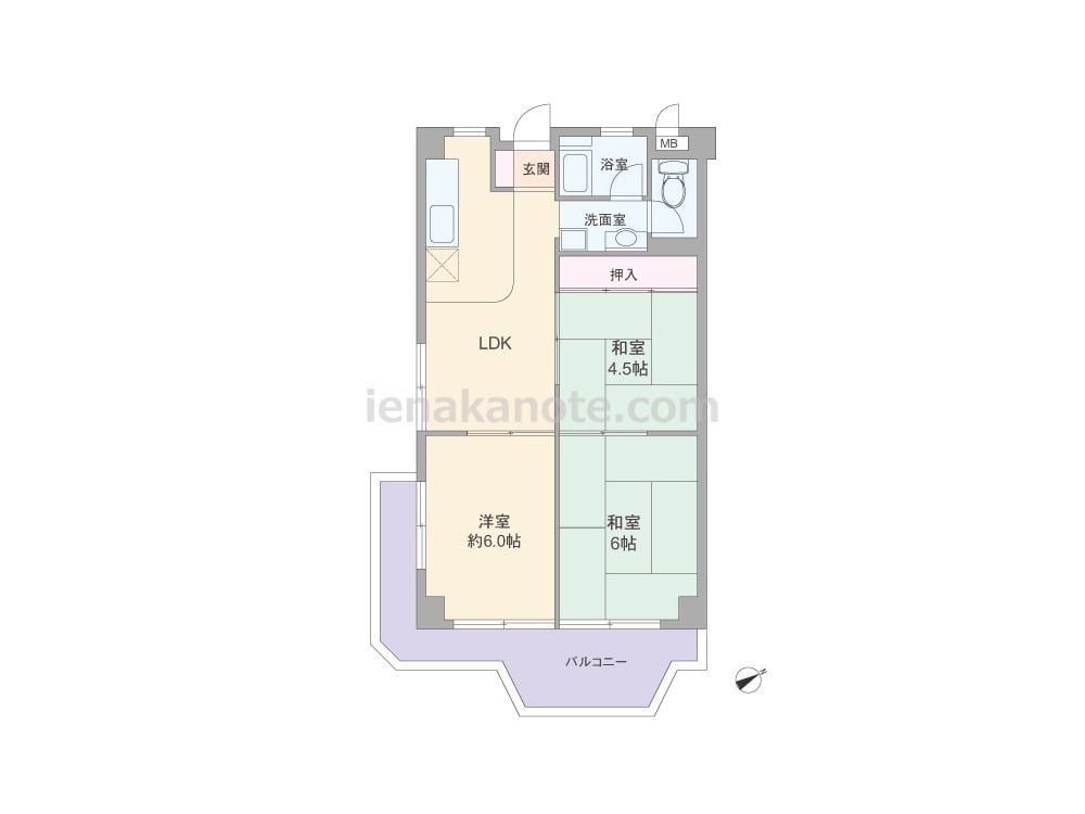 専有面積52.25平米の3LDK。室内廊下が無い、居室空間を優先したプラン。どの部屋もLDKを通って行き来するため、家族のコミュニケーションの機会が増えそうです。キッチン横と浴室の窓は換気がしやすく快適。洋室約6.0帖と和室6帖には収納がありませんが、引き戸を開放すれば空間を広々と使う事ができます。トイレは洗面室を通って出入りする造り。バルコニーは約10.01平米あります。