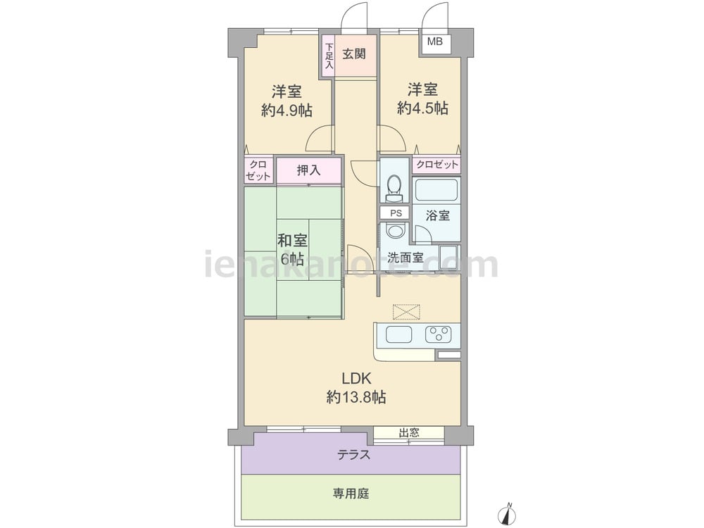 専有面積65.34平米の3LDK。専用庭が付いたプラン。LDK約13.8帖には出窓があります。対面カウンタータイプのキッチンは洗面室へ出入りが可能な2WAY動線。和室6帖も室内廊下とLDKの2カ所から出入りできます。専用庭は子供の遊び場やガーデニングスペースにぴったりです。
