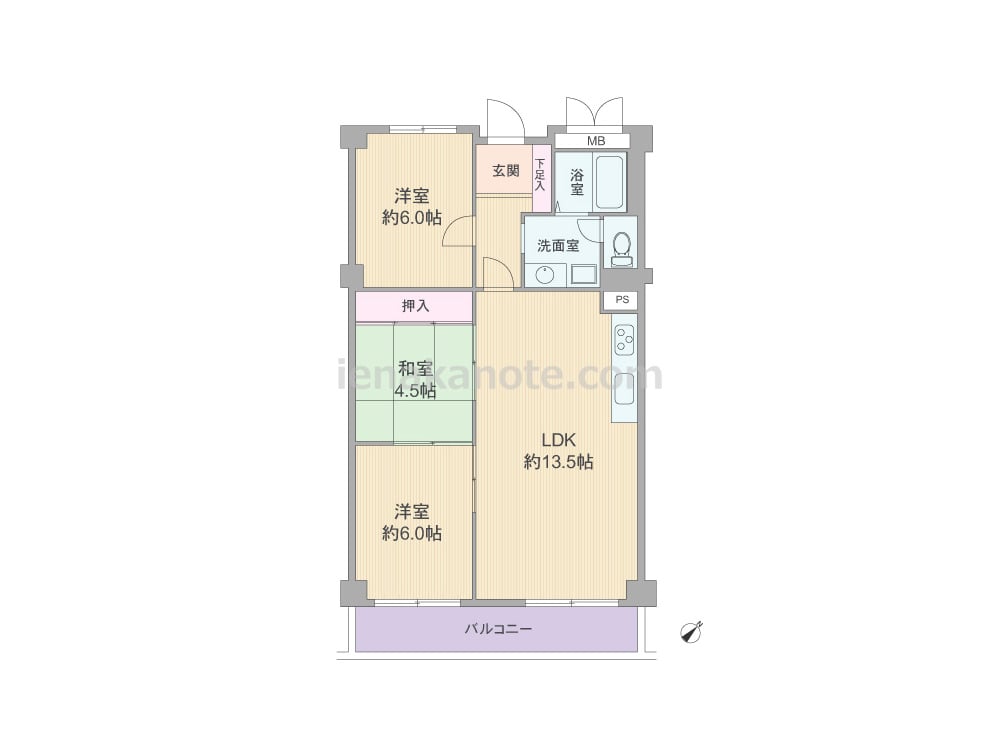 専有面積69.04平米の3LDK。LDK約13.5帖と和室4.5帖、洋室約6.0帖が続き間になったプラン。それぞれ個室にしたり、引き戸を開放して空間をつなげたりとフレキシブルにプラン変更できます。キッチンはI型の壁付け・オープンタイプ。洋室にはクロゼットが無いため、場合により家具の設置が必要です。トイレは洗面室を通って出入りします。
