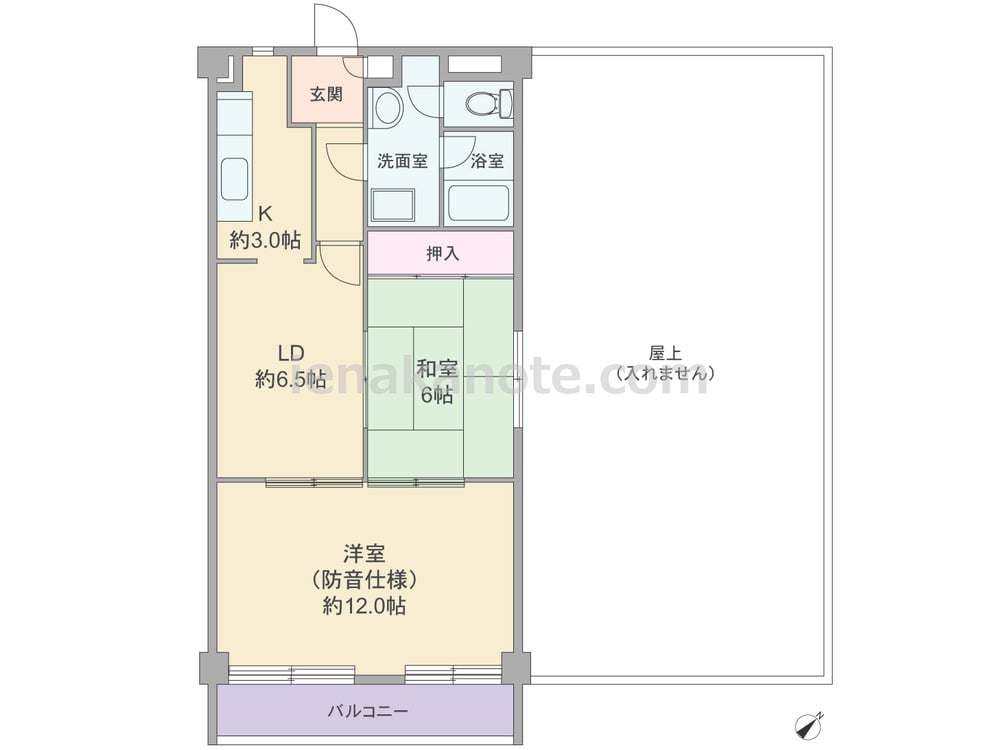 専有面積60.18平米の3LDK。生活感の出やすいキッチンは独立型のため、ダイニングは空間をすっきり保つ事が出来ます。キッチン横の窓は換気がしやすく快適。和室6帖は個室の利用はもちろん、引き戸を開放すればくつろぎのリビングスペースに。防音仕様の洋室約12.0帖は二重サッシが用いられています。
