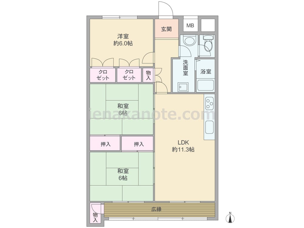 専有面積74.04平米の3LDK。どの部屋も6帖以上のゆとりが確保されています。LDK約11.3帖と和室二部屋が続き間になっており、それぞれ個室にしたり、引き戸を開放してLDKとひと続きの空間にするなど、生活シーンに合わせて自由にプラン変更できます。各居室と室内廊下に収納付き。広縁にも物入があります。