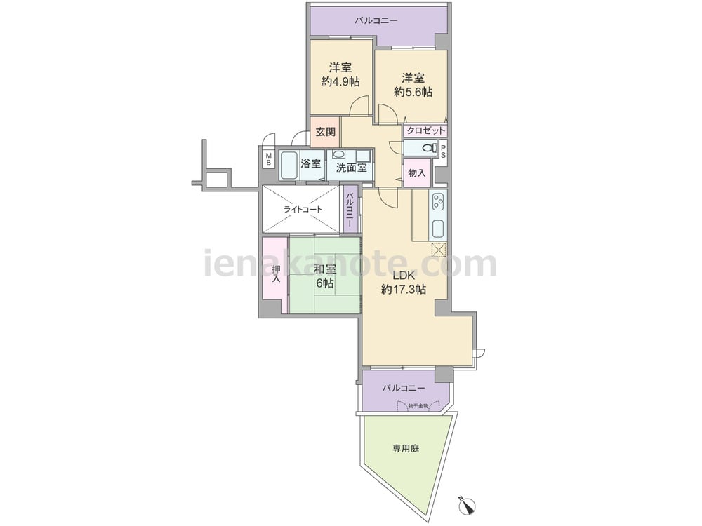 専有面積77.82平米の3LDK。共用廊下に居室の窓が面しておらず、玄関先から直接室内を見通せない、プライバシー重視のプラン。LDK約17.3帖にはコーナーサッシが用いられ、隣接する和室の引き戸を開放すれば約23.3帖大の空間に利用出来ます。洋室約4.9帖には収納がありませんが、その他の居室と室内廊下に物入付き。浴室・洗面室はライトコートに面して窓があります。北東・南西の二面にバルコニーがあり、専用庭は約13.00平米の広さがあります。