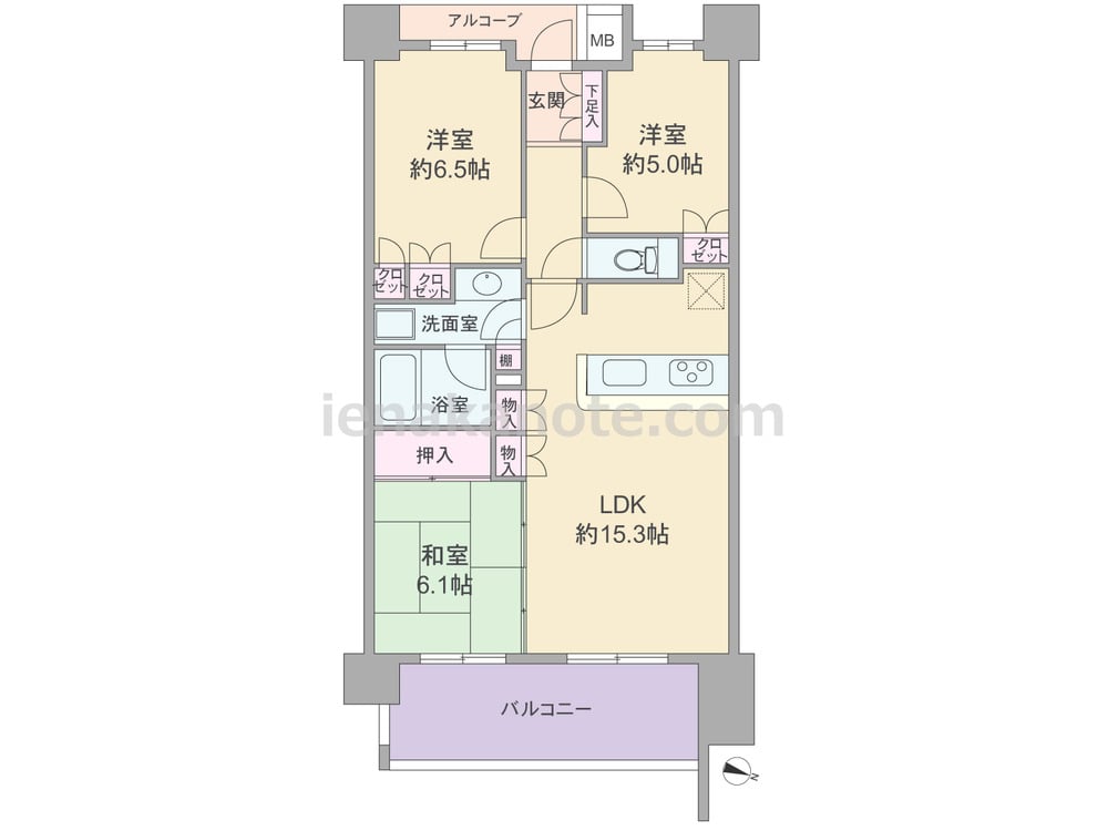 専有面積65.21平米の3LDK。玄関前にアルコーブがあります。LDK約15.3帖には和室が隣接しており、くつろぎのリビングスペースや個室など色々な用途に利用可能。キッチンは対面カウンタータイプの仕様。キッチン横に洗面室・洗濯機置場があり、家事効率の良い造りです。収納が各所に設けられていますが、洋室約6.5帖、洋室約5.0帖のクロゼットは容量が少ないため、家具の配置が必要かもしれません。バルコニーは約11.65平米あります。