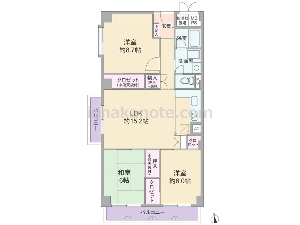 専有面積80.00平米の3LDK。全部屋6帖以上のセンターリビングのプラン。キッチンは使いやすいL字の壁付けオープンタイプ。LDKと洋室、和室が続き間のため、繋げたり、区切ったり、生活シーンに合わせてフレキシブルに使用可能。LDKに面してバルコニーがあるのもうれしいところ。主寝室は約8.7帖大。間口1間の収納が3ヶ所、それ以外にも物入、クロゼットがあり、収納スペースも充実しています。