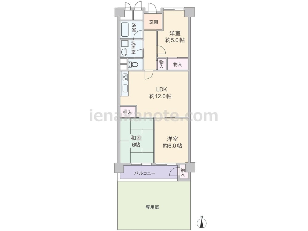 専有面積66.25平米の3LDK。専用庭が付いたプラン。LDK約12.0帖は部屋の中央に位置し、キッチンは空間を有効利用できる壁付けタイプ。洋室約6.0帖の引き戸を開放すれば、約18.0帖大の一つの空間にする事が出来ます。洋室約6.0帖には物入がありませんが、その他の居室と室内廊下、バルコニーに収納スペース付き。トイレへは洗面室を通ってアクセスします。専用庭約33平米は子供の遊び場やガーデニングスペース、アウトドアリビングなど色々な楽しみ方が出来そうです。
