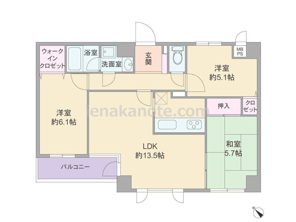 専有面積73.35平米の3LDK。全居室に窓があるプラン。二面採光のLDK約13.5帖にはコーナーサッシが用いられています。和室は個室に利用したり、リビングの延長にしたりと、色々な使い方ができそうです。洋室約6.1帖にはウォークインクロゼットがあり、その他の居室にも収納が確保されています。
