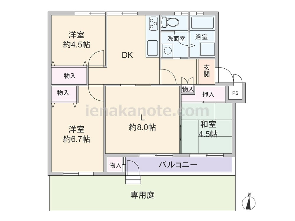 専有面積65.08平米の3LDK。専用庭付き・戸建感覚プラン。どの部屋もDKを通って行き来するため、家族のコミュニケーションの機会が増えます。リビング約8.0帖と和室4.5帖も続き間で、引き戸を開放して約12.5帖の空間にする事も可能。各居室とバルコニーに収納が確保され、トイレ・浴室の窓は換気がしやすく快適です。専用庭は約26.0平米あり、ガーデニングやアウトドアリビングはもちろん、子供の遊び場にもぴったりです。
