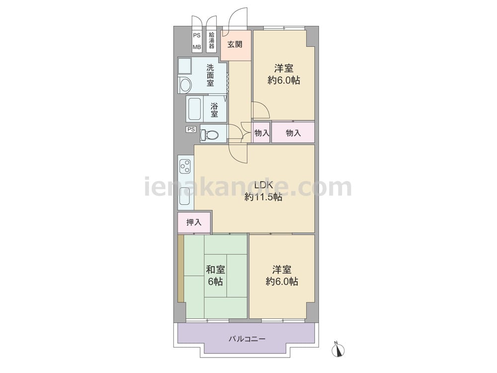 専有面積66.92平米の3LDK。全部屋6帖以上のゆとりが確保された、センターリビングのプラン。LDK約11.5帖と続き間の洋室約6.0帖の引き戸を開放すればLDK約17.5帖大にプラン変更が可能。ただし、この洋室には収納が無いため、家具の配置が必要かもしれません。和室6帖は板間付き。バルコニーは一部出幅があります。