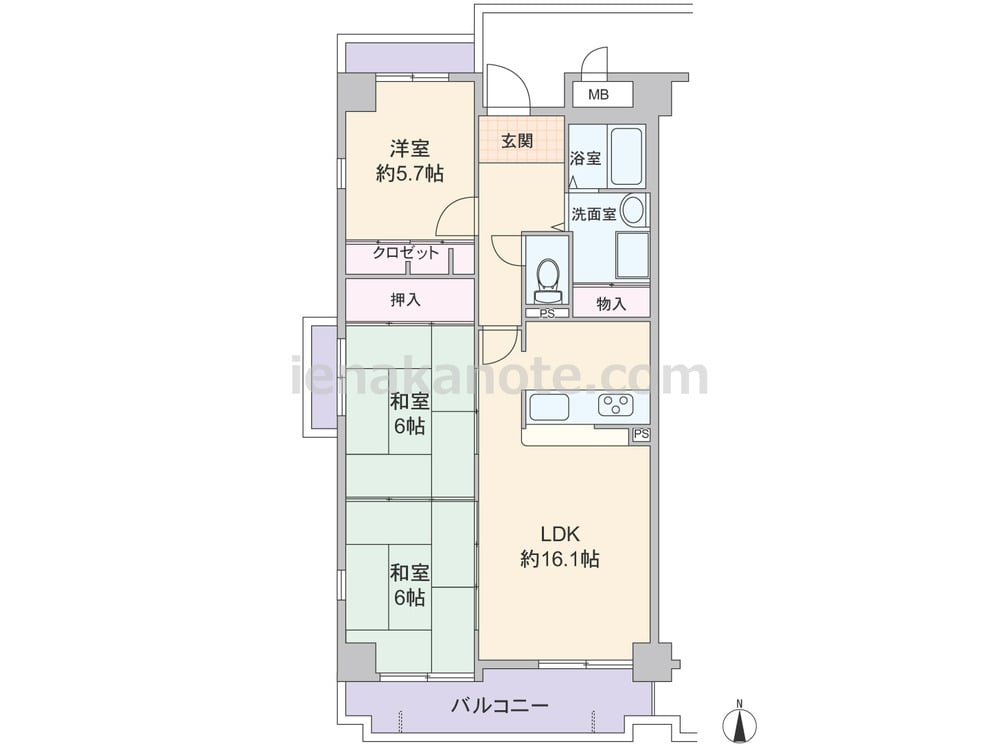 専有面積76.37平米の3LDK。共用廊下に直接面する窓が無い、独立性の高いプラン。LDK約16.1帖と和室二部屋が続き間になっており、和室の引き戸を開放すれば最大約28.1帖大の空間に利用出来ます。キッチンは家族の顔を見ながら作業が出来る対面式。収納は中央和室6帖と洋室約5.7帖、洗面室の3カ所に設けられています。