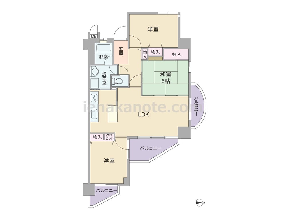 専有面積75.04平米の3LDK。全部屋+浴室に窓がある風通しの良いプラン。LDKは部屋の中央に位置し、東側の洋室を子ども部屋にすればコミュニケーションの機会が増えます。キッチン背面にカウンターがあり、洗面室へアクセス可能な2WAY仕様。和室6帖もLDKと玄関ホールの2カ所から出入りでき、LDK側の引き戸を開放すればLDKをより広々と使う事ができます。バルコニーが全部で3カ所あり、ガーデニングコーナーにしてもよさそうです。